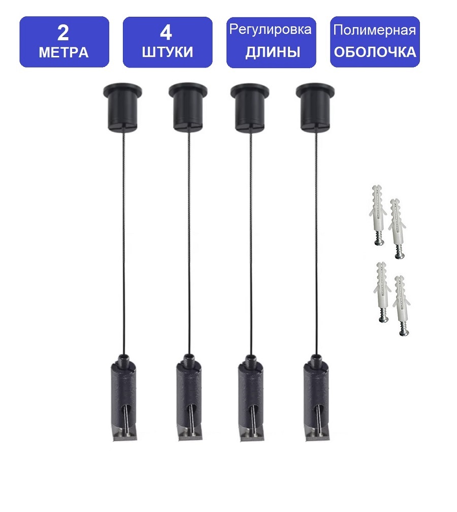 В набор входит 4 качественных стальных троса длиной 200 см, а также универсальный крепеж к потолку и подвешиваемому оборудованию. Длина (высота) подвеса плавно регулируется (см. схему). Стальные тросики - в плотной полимерной оболочке во избежание разлохмачивания и для защиты от коррозии, в случае установки во влажной среде. Длина (высота) подвеса легко регулируется.